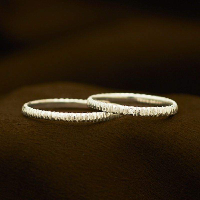 CASUCA ならではの細かいスクラッチを施したデザイン。 スクラッチは光を受けて独特の輝きを放ちます。 角に丸みを施して柔らかく指にフィットします。 リング幅 2.0 mm のリングの表面中央にダイヤを一石セッティングしております。