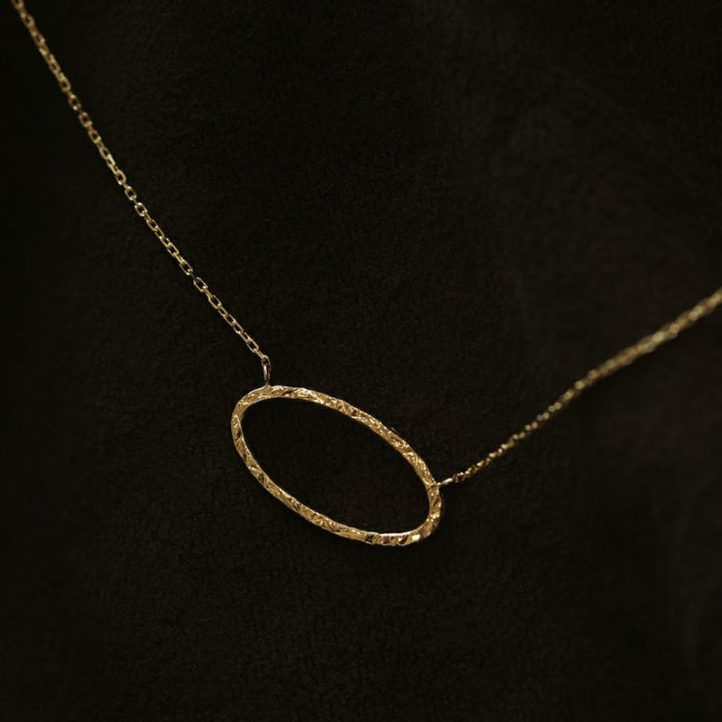 クラシカルなオーバルに、ラフなタッチでテクスチャーを入れた、単純だけれどキラキラと輝くモチーフ。